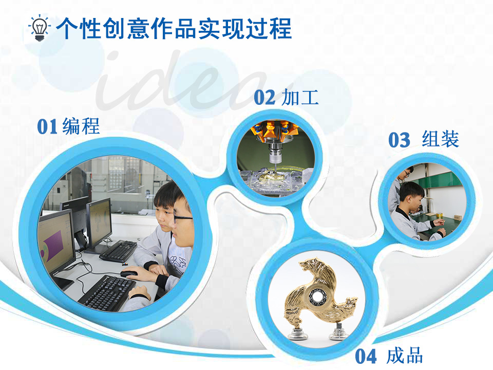 精雕学校开创“学生自创自制个性作品”的教学模式,让学生结合培训知识点,独立设计、加工、组装属于自己的创意作品,让学生在寓教于乐中掌握实用技术。
