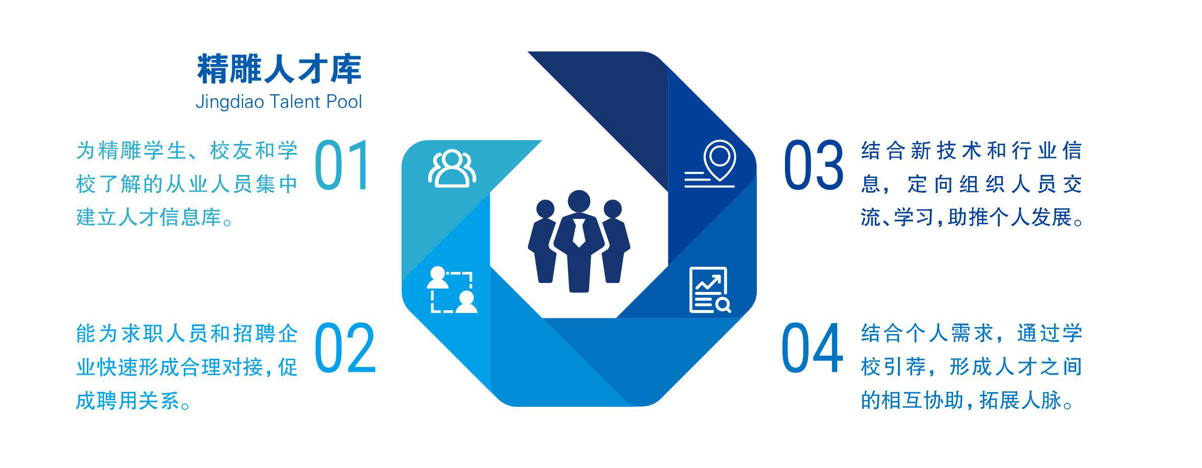 学校为校友集中建立人才信息库,为求职人员和招聘企业快速形成合理对接,助力校友发展。